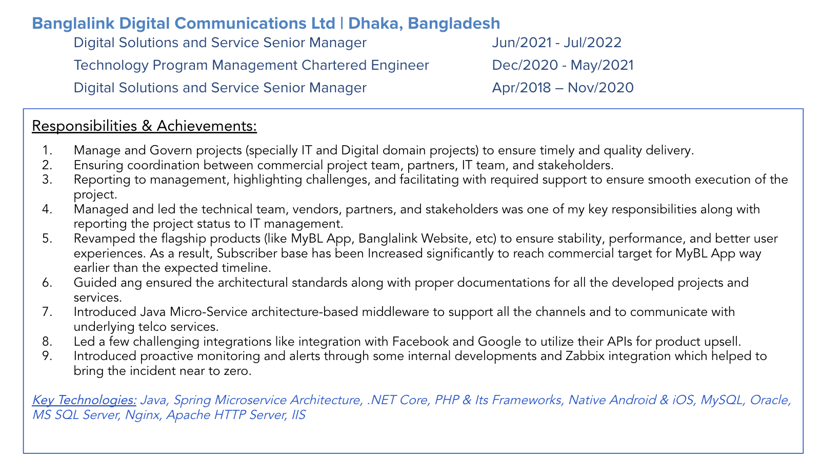 It was very short (7-8 months) but memorable journey with Bari as his manager though we know each other for more than 2 years in Banglalink. Professionally, Bari has a solid & keen knowledge in SW development specially in current digital transformation. In Banglalink, He has already contributed a lot in internal SW development & also SW development by strategic partners in many digital initiatives. He is extra ordinarily organized & committed professional. His polished leadership skill & technical expertise have made him successful in different projects.